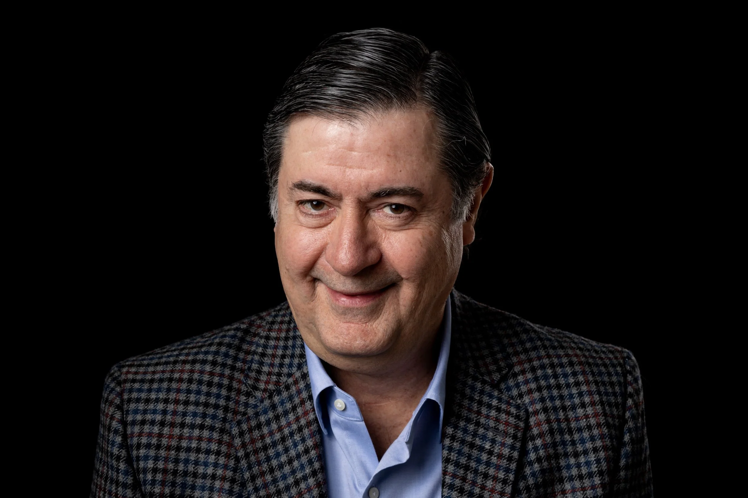 Hombre sonriente con traje oscuro y corbata roja en fondo negro.